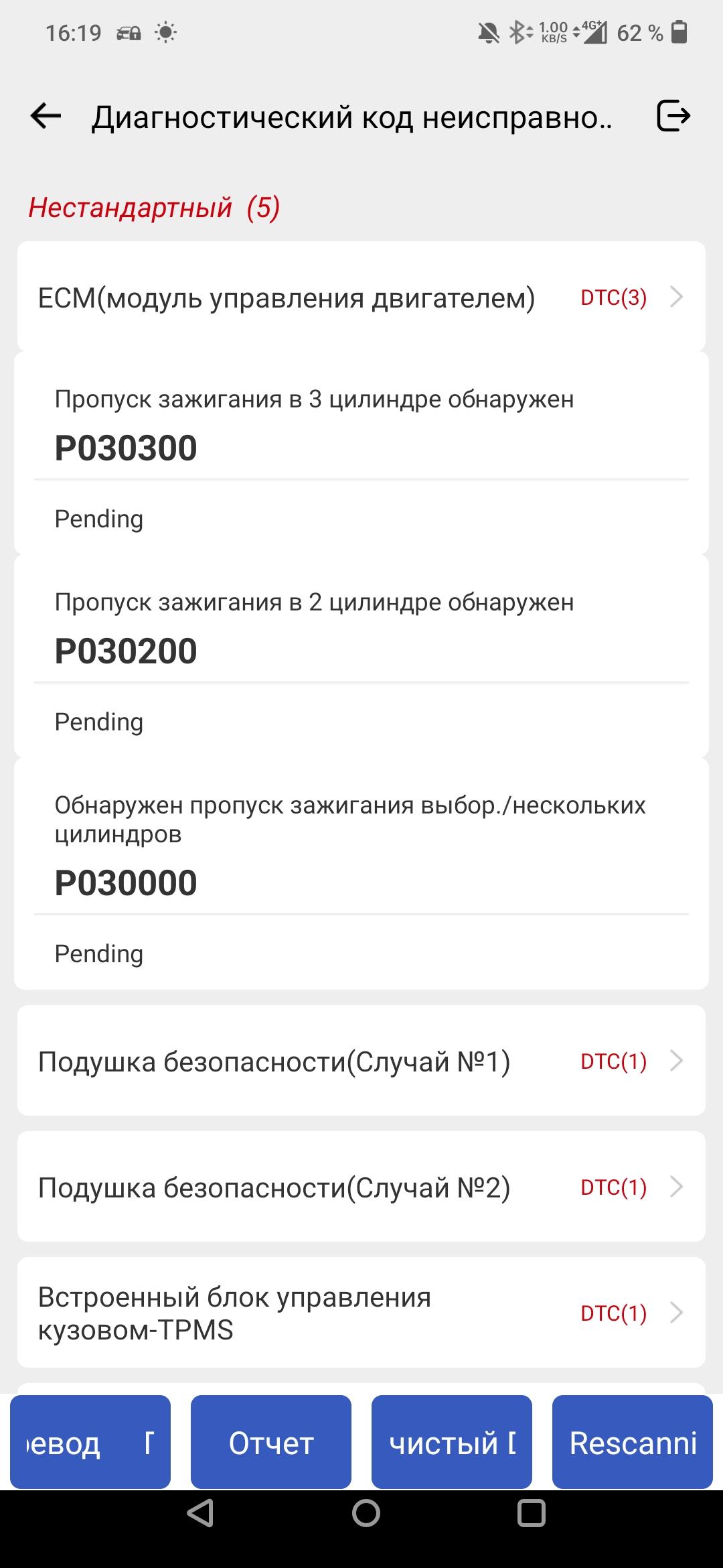 Это скриншот приложения. На экране отображается список диагностических кодов неисправностей автомобиля. Видны разделы, относящиеся к двигателю, подушкам безопасности и блоку управления кузовом. В каждом разделе перечислены коды ошибок и их статус.