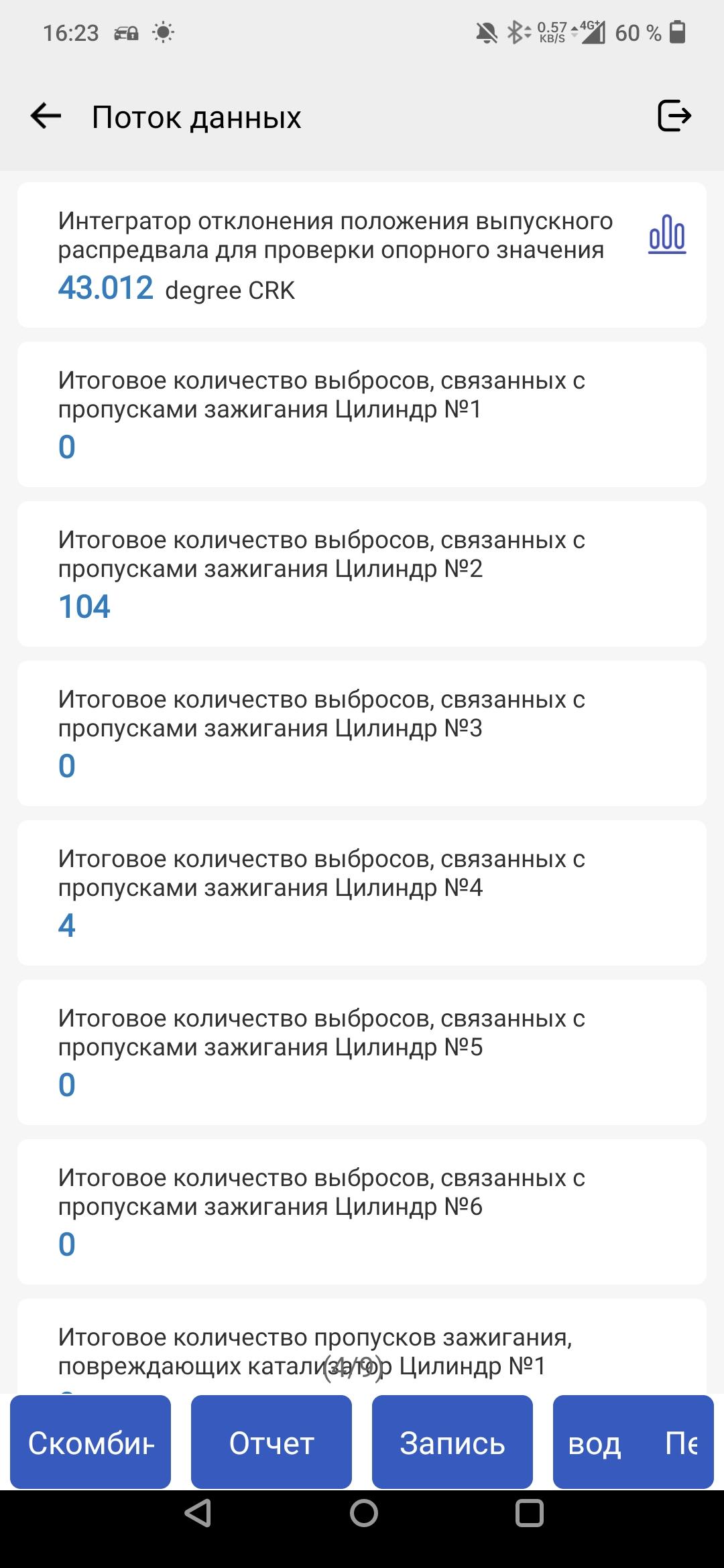 Это скриншот. На экране отображается список данных, связанных с работой двигателя. Каждая строка содержит информацию о количестве сбоев или отклонений, связанных с определенным цилиндром или компонентом двигателя. Видны числовые значения, указывающие на количество таких событий.
